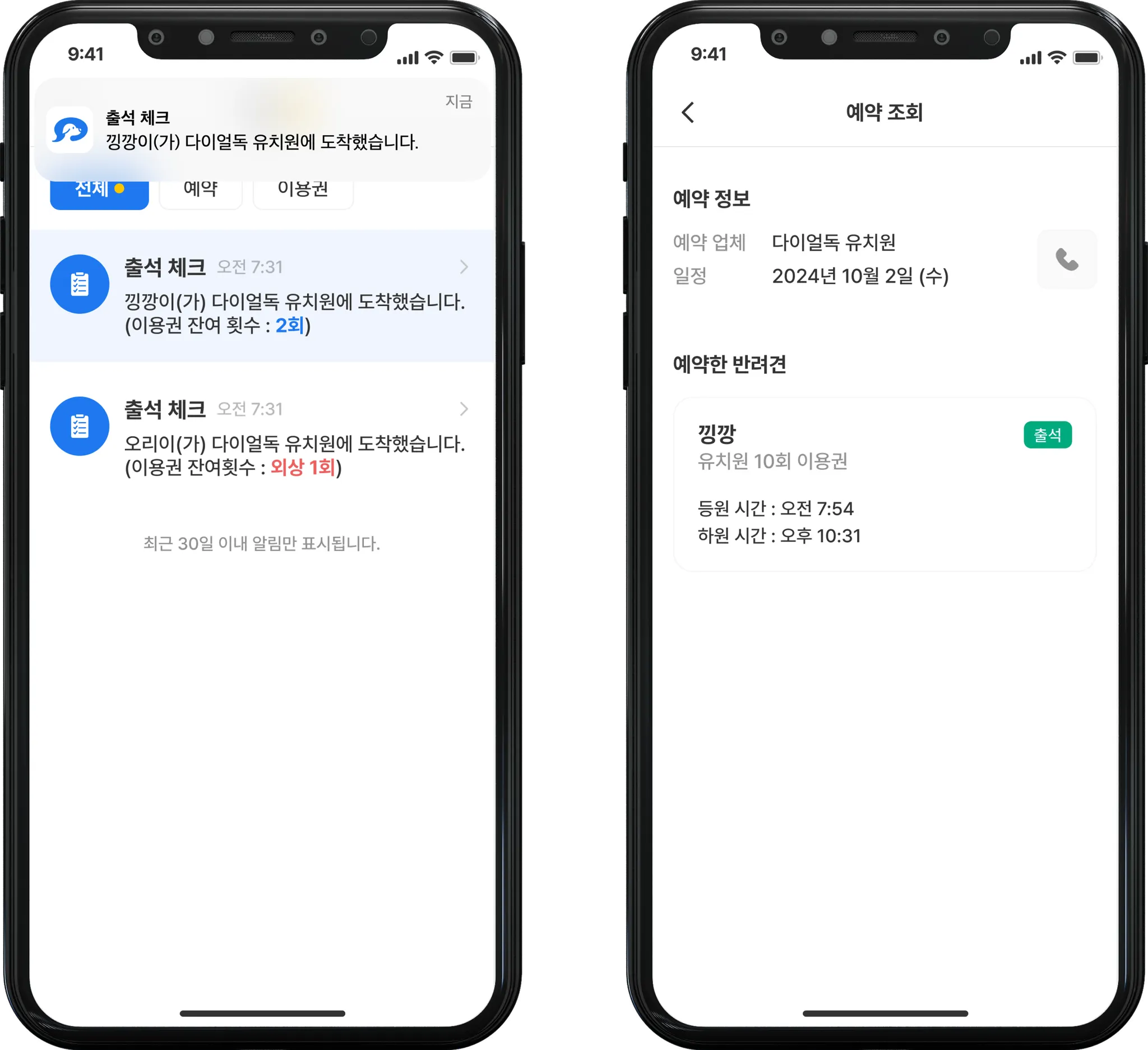 등원 또는 하원 시 회원님의 앱으로 알림이 전송됩니다.