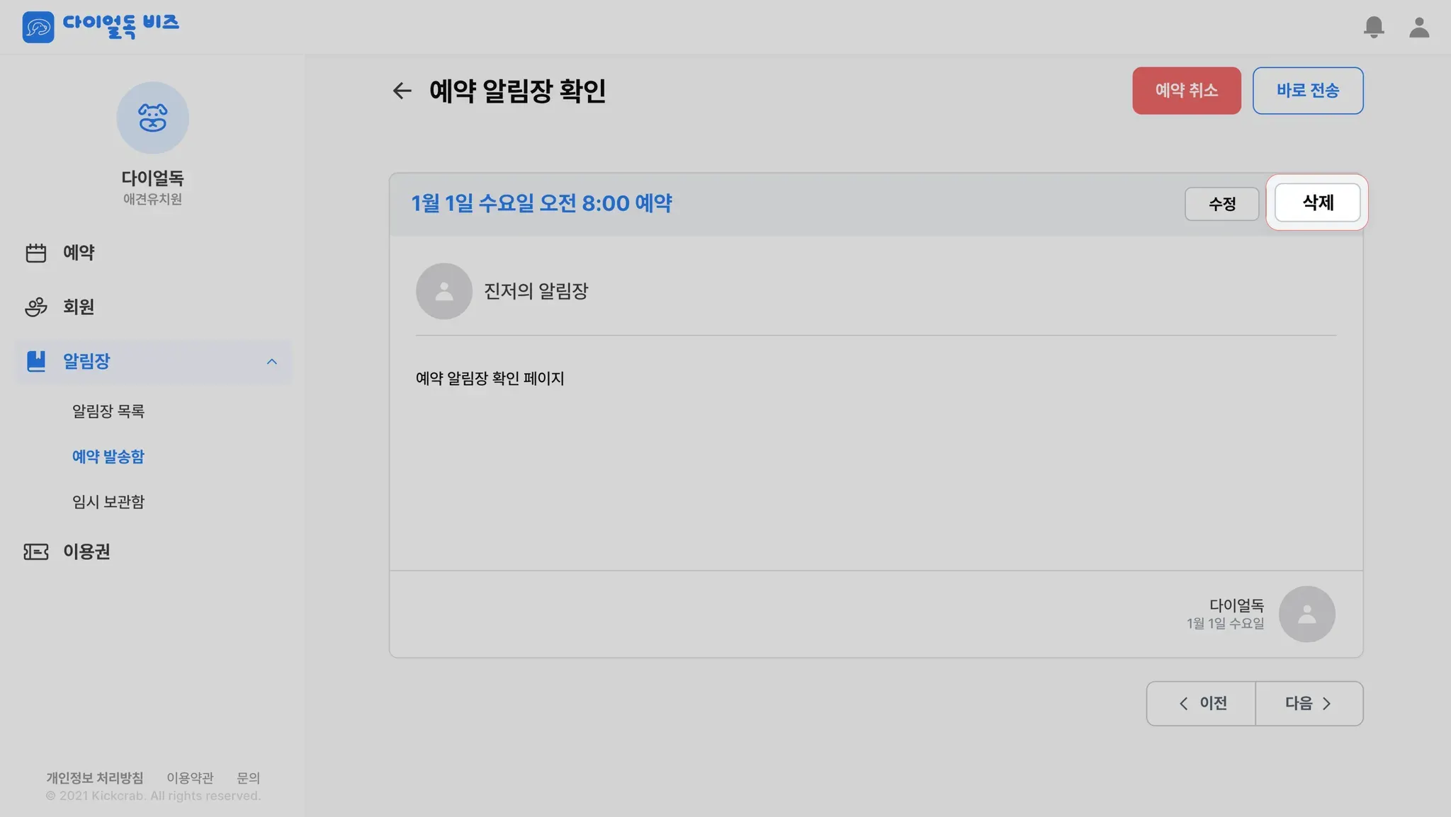 예약 알림장 상세 화면에서 오른쪽 상단에 삭제 버튼을 누릅니다.