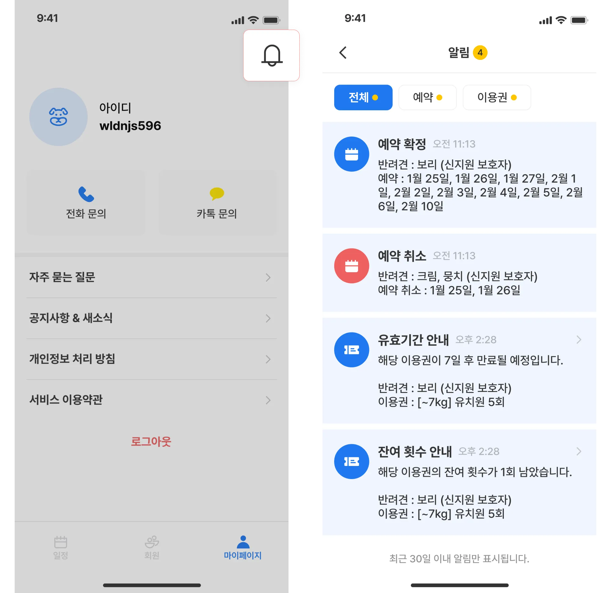 회원앱 이용권·예약 관련 알림