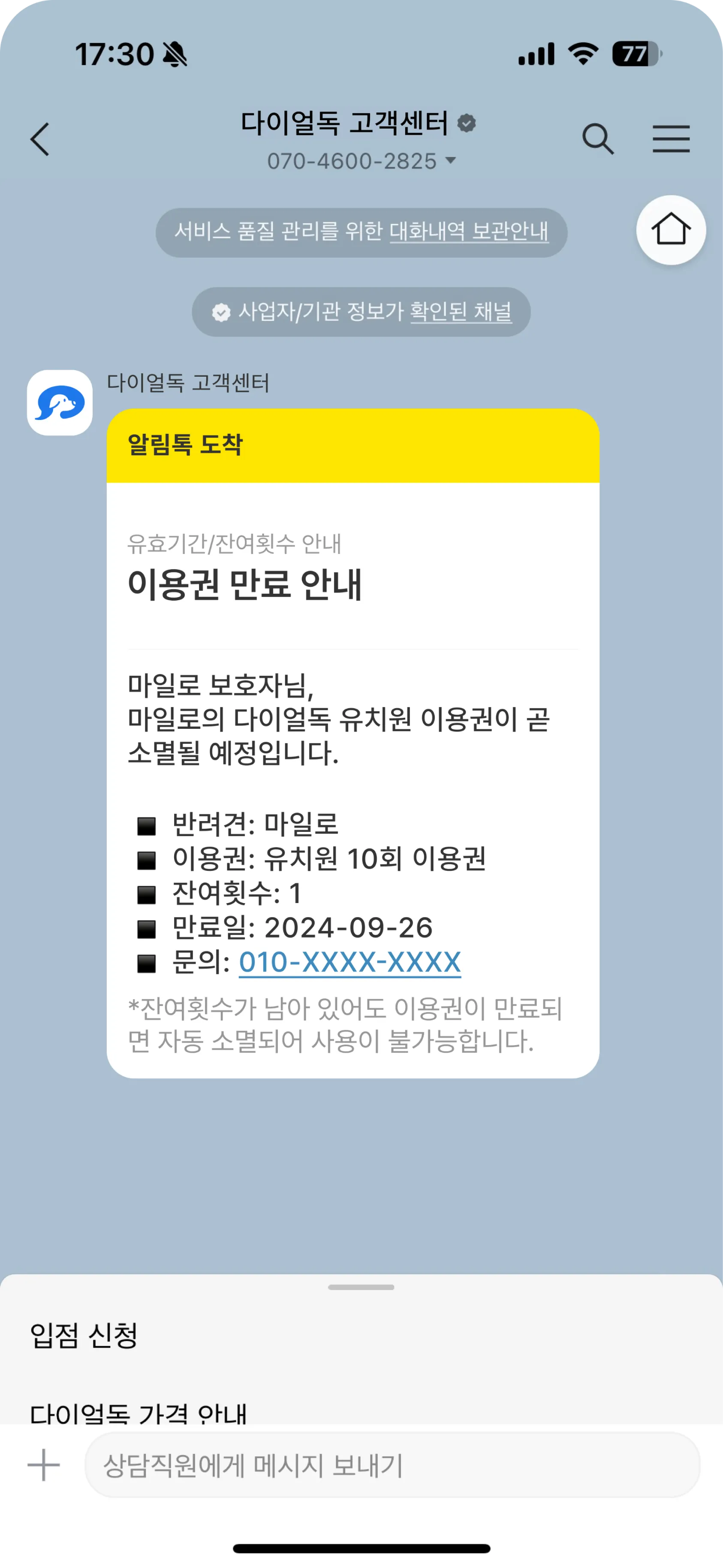 *예시 이미지입니다. 이미지 상에서 보이는 유치원, 반려견, 이용권 이름은 모두 회원이 등록한 이름으로 전송됩니다.