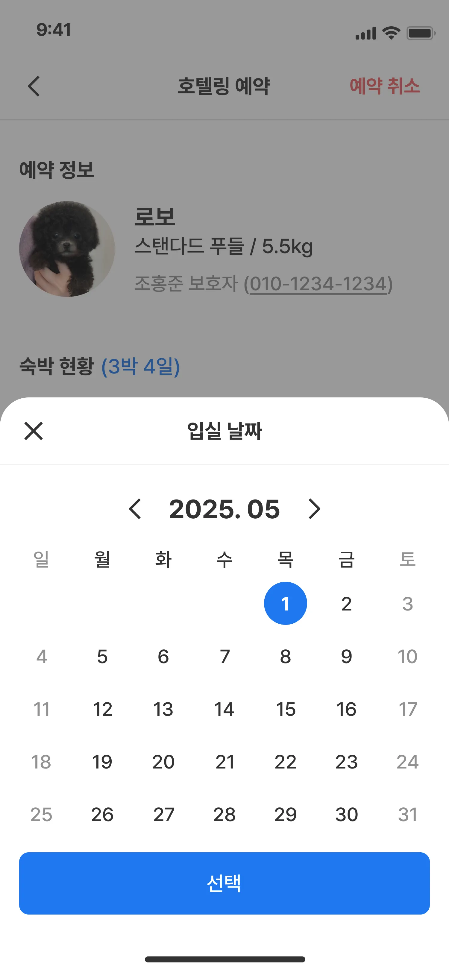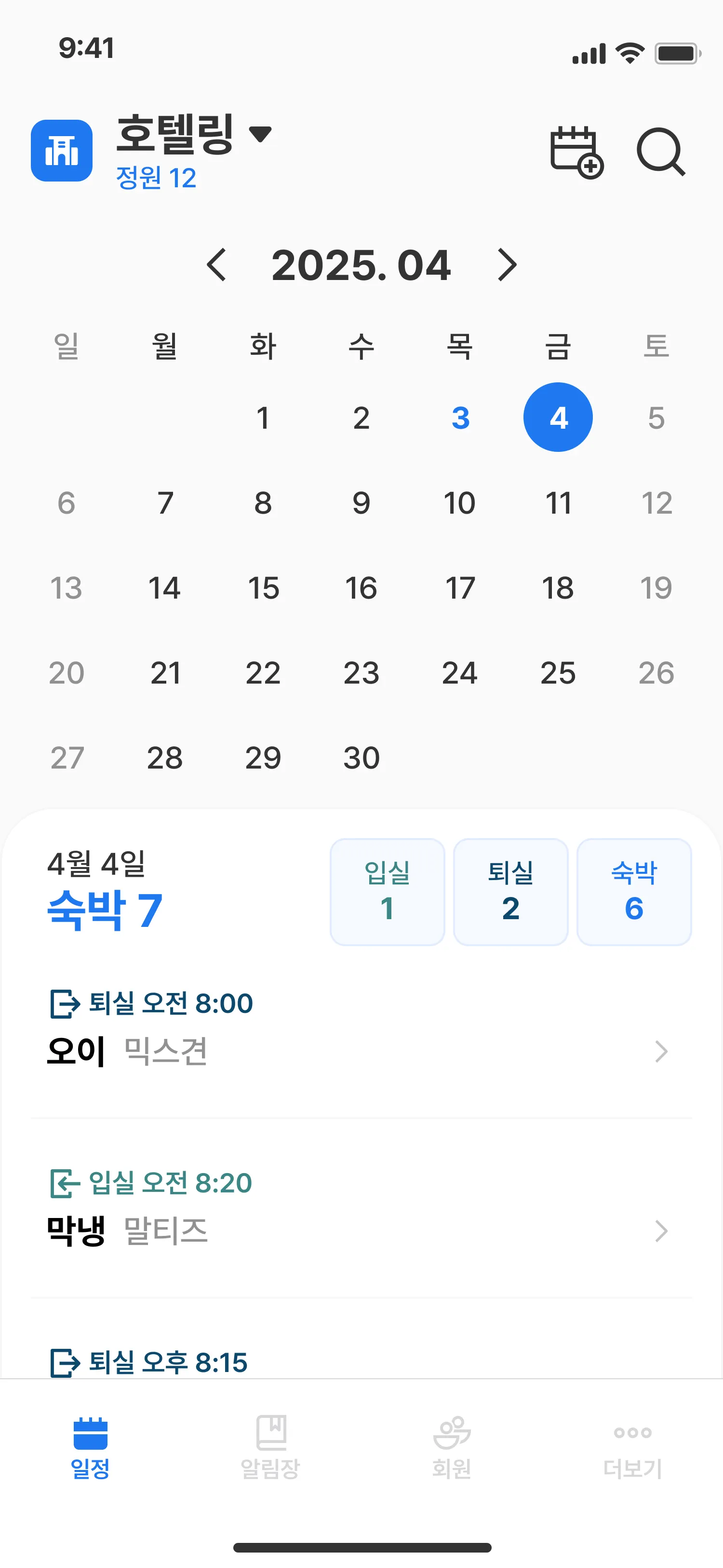 예약 상세 화면에서는 입·퇴실 시간을 동시에 수정할 수 있습니다.