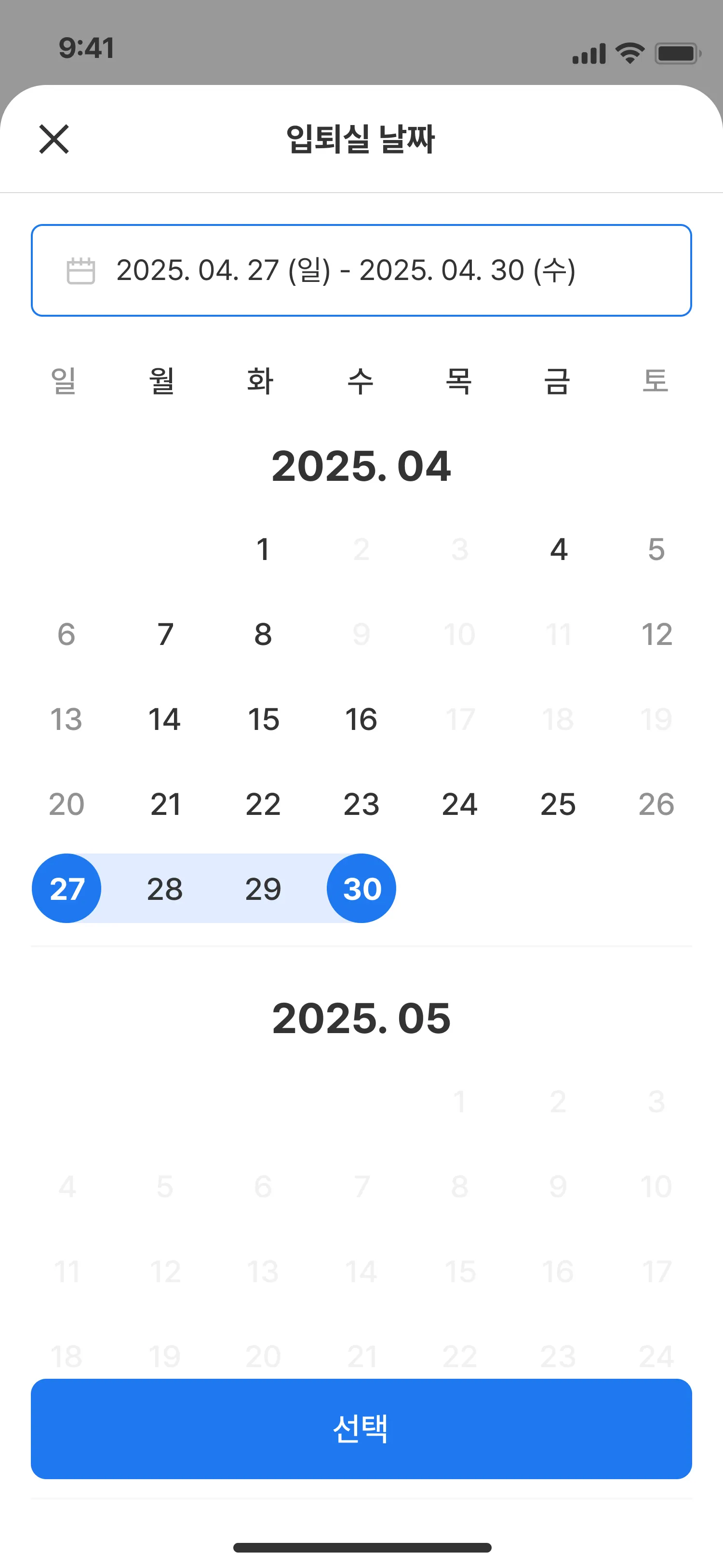 달력에서 입실 날짜와 퇴실 날짜를 선택합니다.