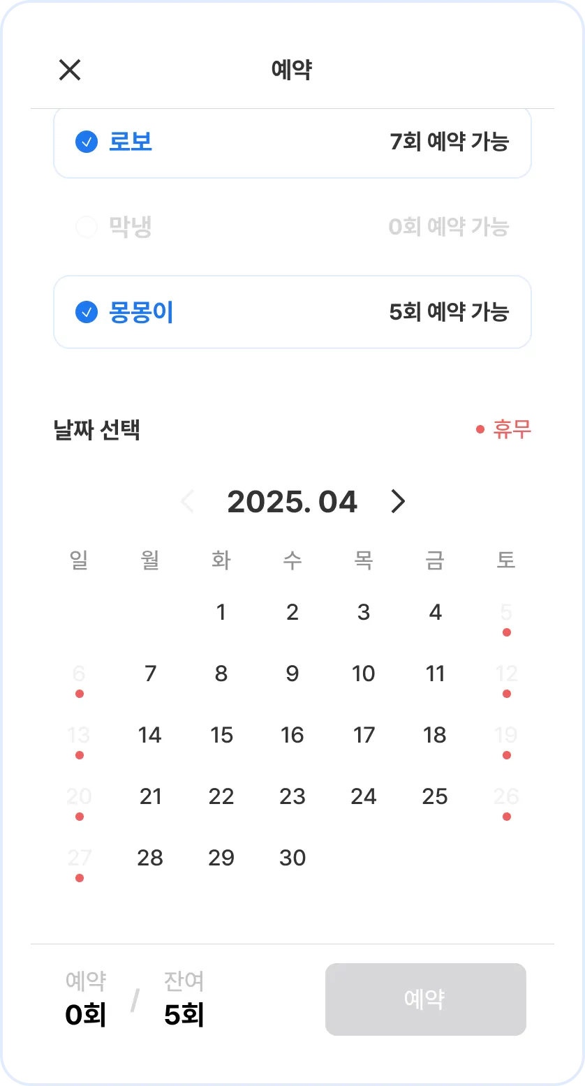 보호자 앱의 예약 등록 화면. 휴무일은 선택 불가