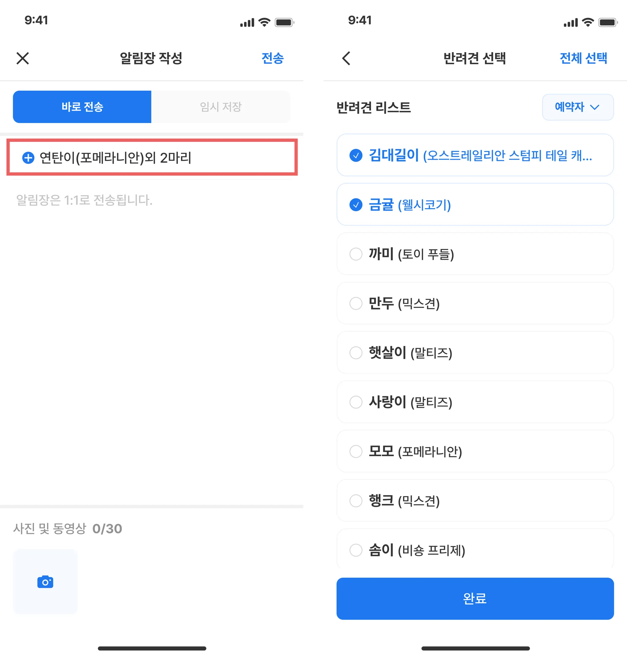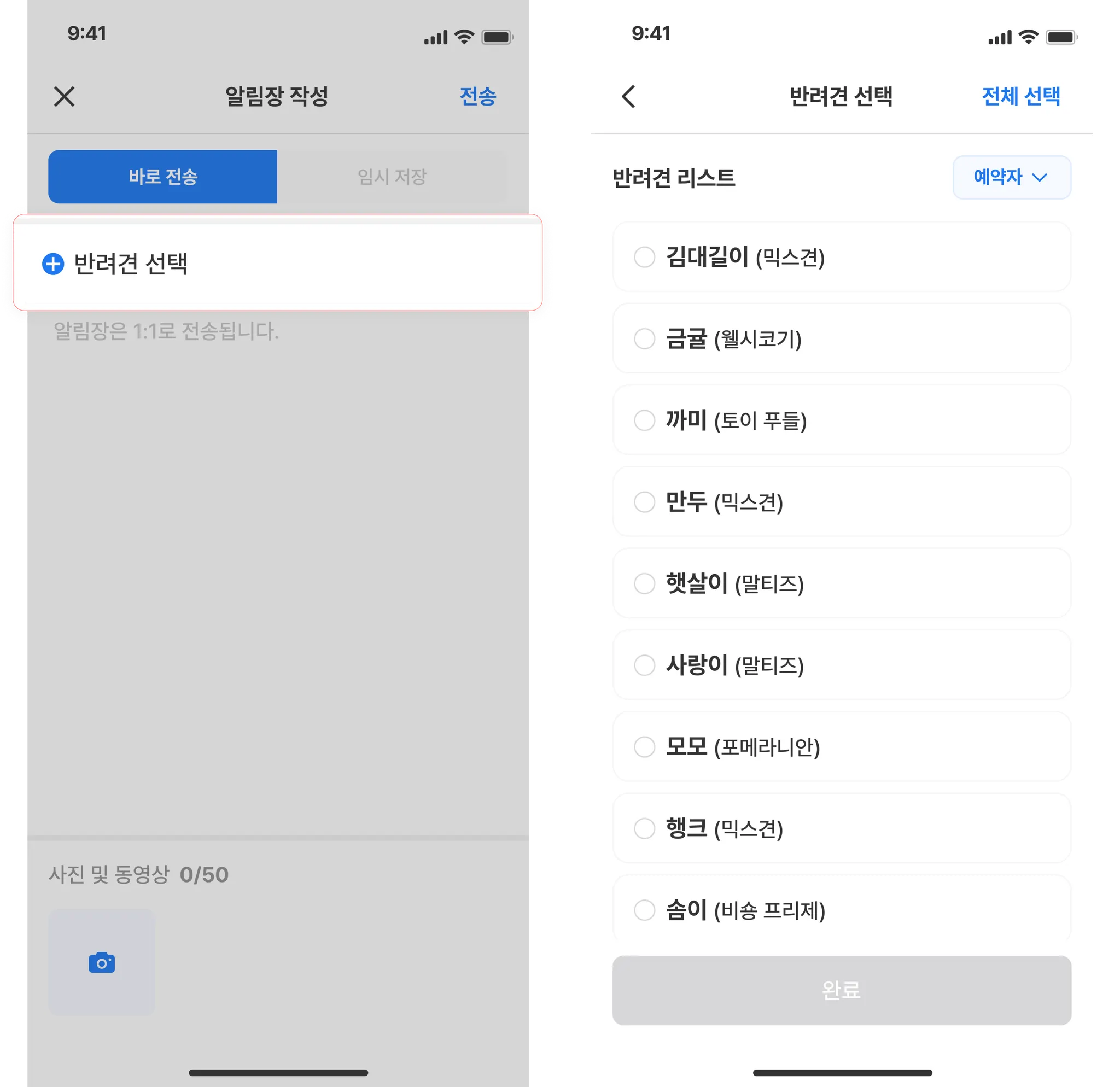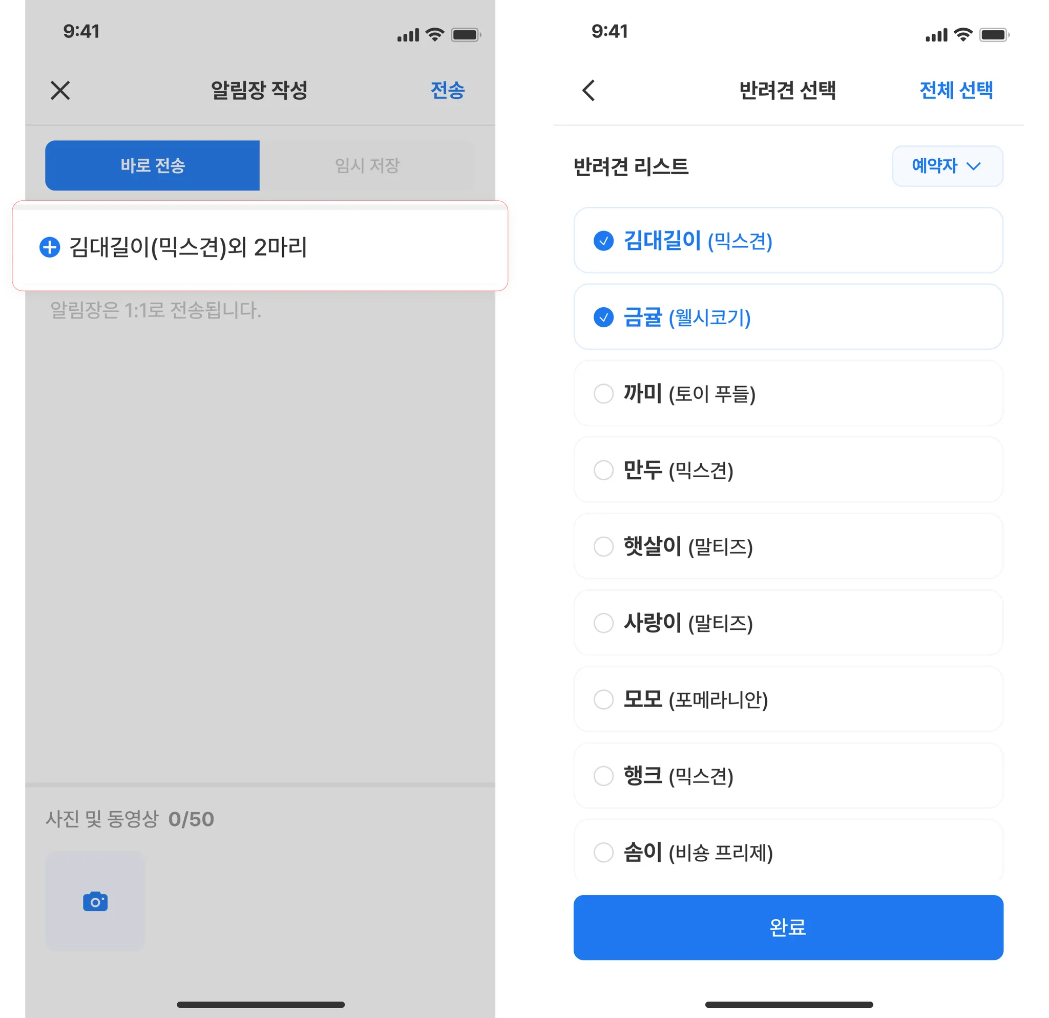 알림장을 보내고자 하는 반려견을 선택합니다.