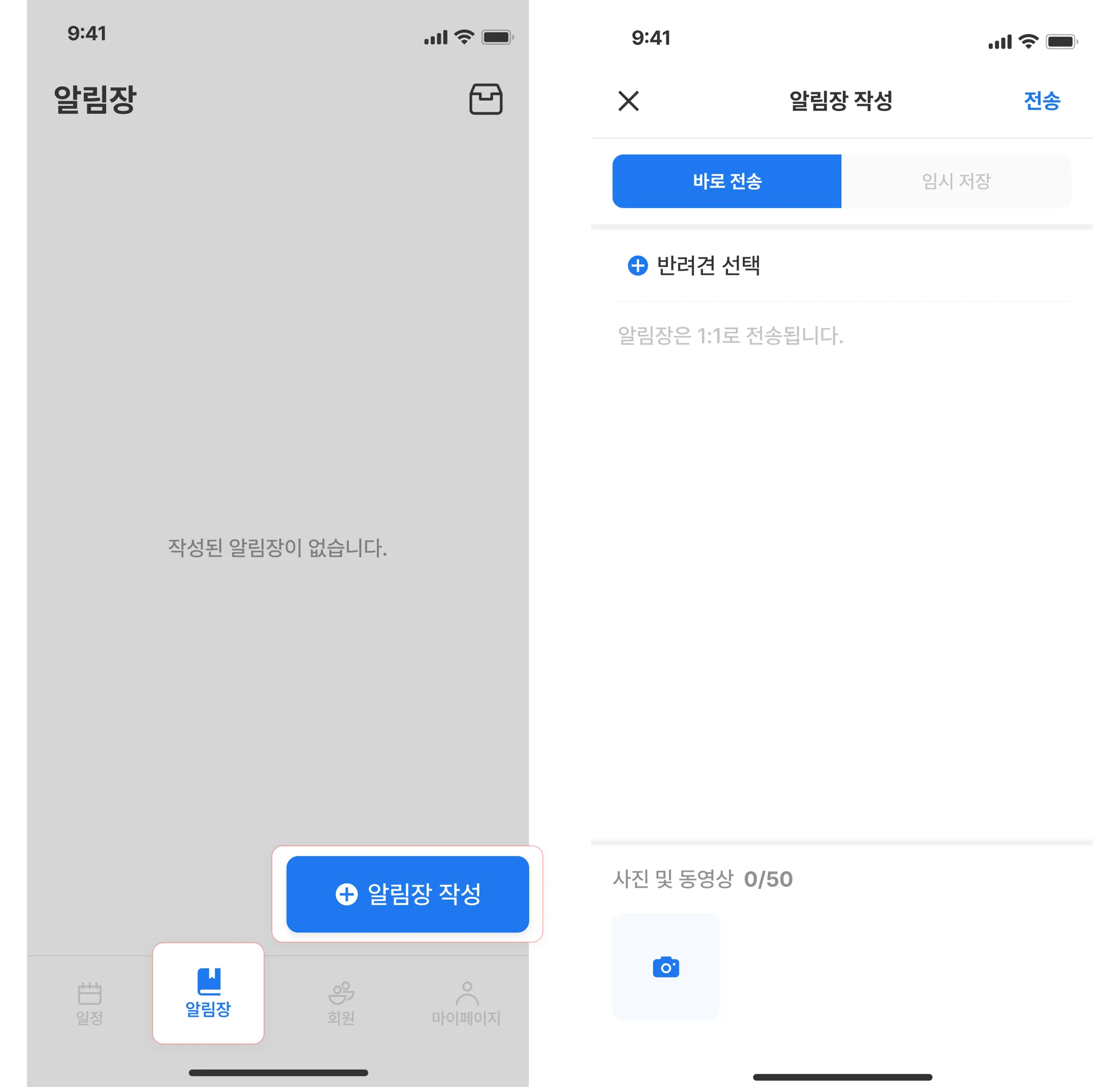 알림장 작성 화면과 전체보기 화면에서 모두 가능해요.