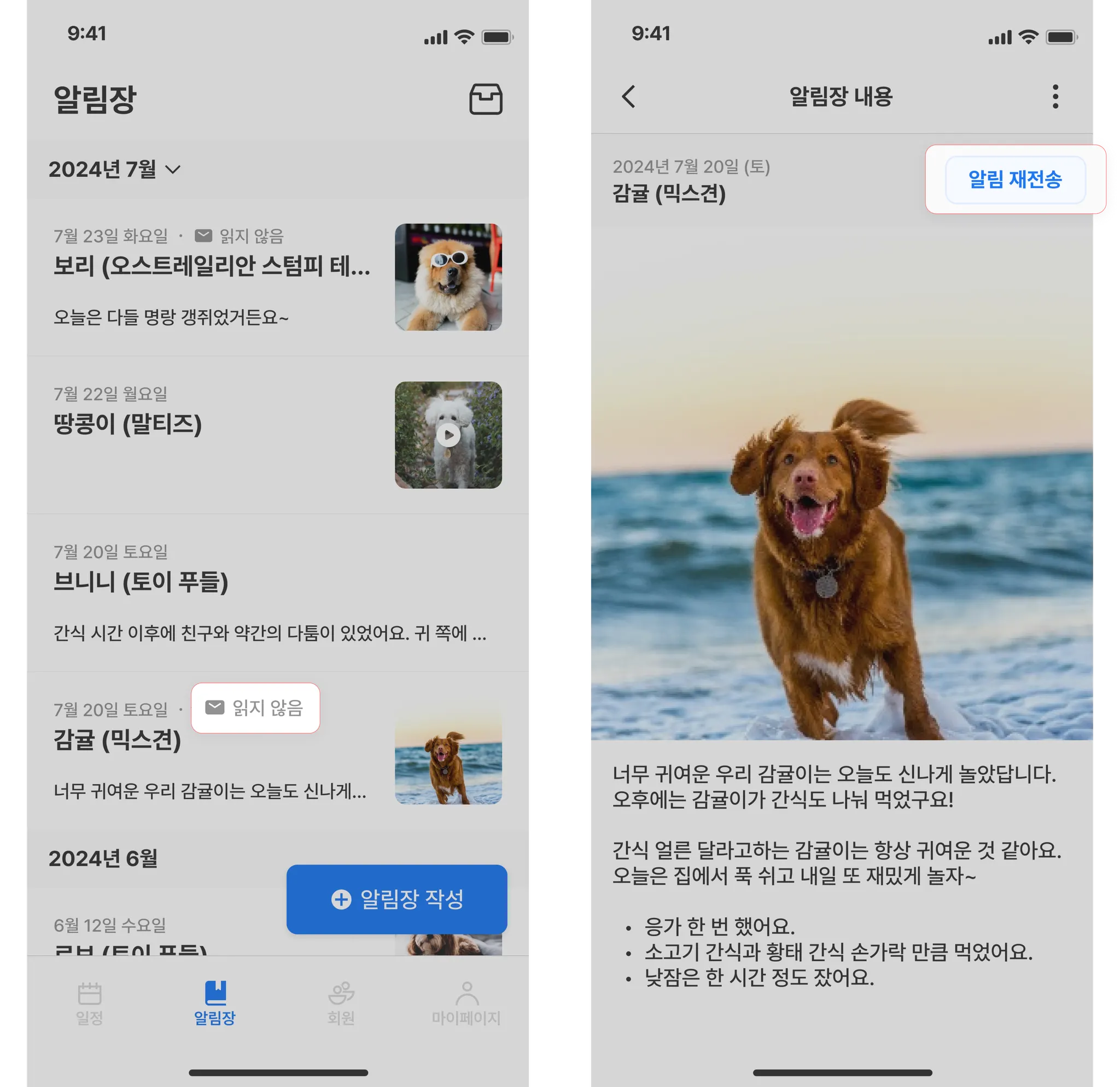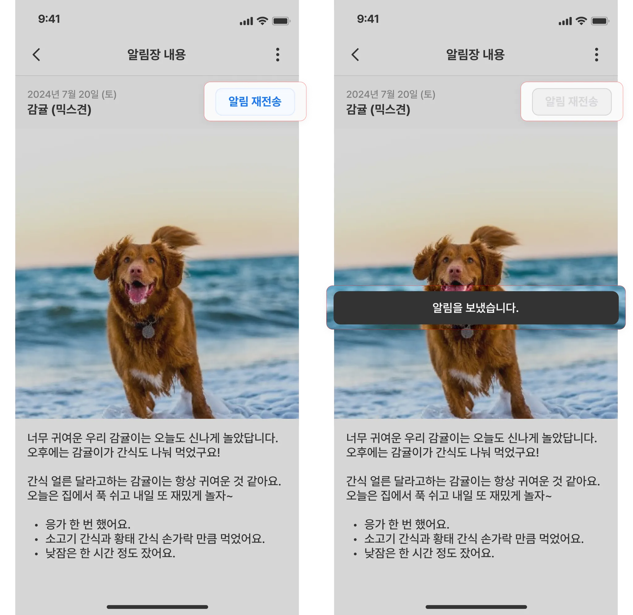 보호자가 알림장을 읽지 않은 경우에는 알림 재전송 버튼이 뜹니다.